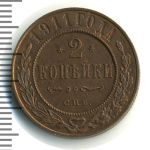 вверху вдоль края монеты обозначение год выпуска «1911 ГОДА» ниже слева вдоль края монеты лавровая ветвь, справа дубовая, внизу ветви соединяются и перевязаны лентой, в середине в ободке из точек обрамленный слева и справа звездочками номинал монеты - цифра «2», ниже слово «КОПЕЙКИ», под ним две направленные в разные стороны фигурные черты, ниже обозначение монетного двора «СПБ».