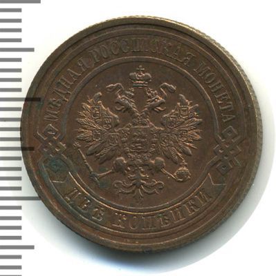 вверху вдоль края монеты в выделенной выступающей рамкой полосе надпись «МЕДНАЯ РОССИЙСКАЯ МОНЕТА», внизу вдоль края монеты в выступающей рамке, соединённой с верхней рамкой расположенными слева и справа фигурными решетками, на выступающей плашке вдавленными буквами обозначение номинала монеты «ДВЕ КОПЕЙКИ», в середине Малый Государственный Герб Российской империи.