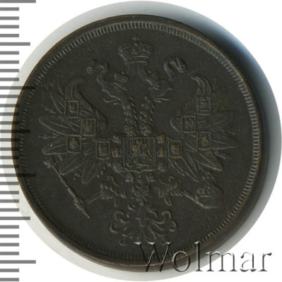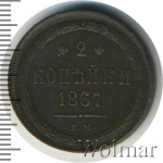 вдоль края монеты венок вверху, внизу, слева и справа крестообразно перехваченный лентами, внутри венка вверху обрамленный слева и справа цветочными розетками номинал монеты цифра «2», ниже слово «КОПЕЙКИ», под ним год выпуска монеты «1867.», ниже две смотрящие в разные стороны фигурные черты и под ними обозначение монетного двора «ЕМ».